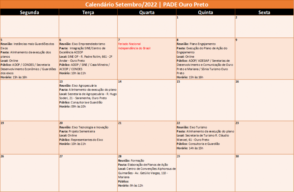 Calendário de atividades de Setembro | PADE OURO PRETO